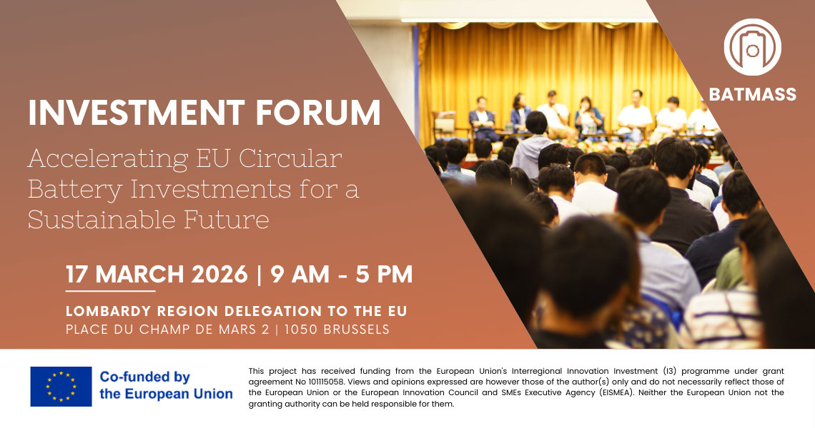 On 17 March 2026, the European BATMASS project will host the first CBV Investment Forum – Accelerating EU Circular Battery Investments for a Sustainable Future, an invitation-only event bringing together investors, policymakers and circular battery innovators. The forum will take place in Brussels, at the Lombardy Region Offices, and will be held in English.