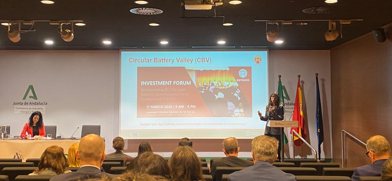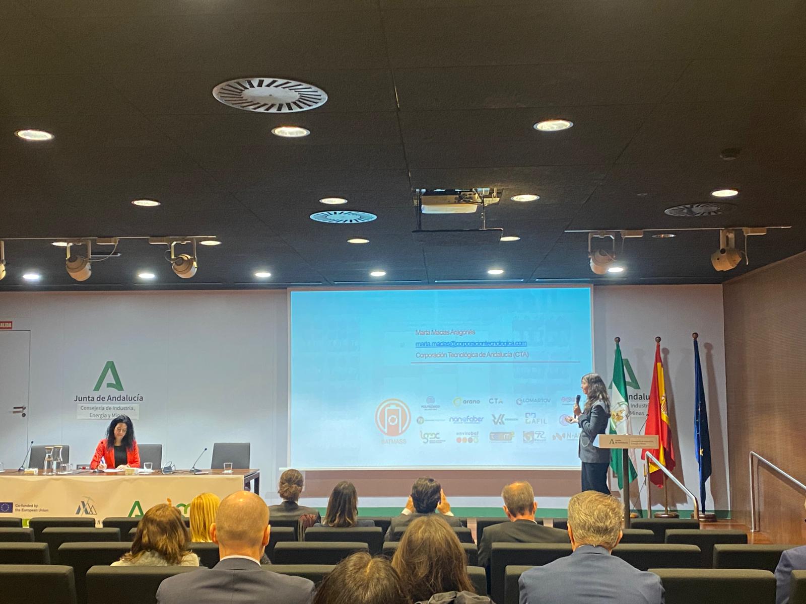 During the event, Marta Macías from CTA (Corporación Tecnológica de Andalucía), partner of the BATMASS project, introduced the project’s objectives and its role in advancing circular solutions for the European battery value chain. The presentation highlighted BATMASS’ work in battery recycling, materials recovery and circular business models aimed at strengthening Europe’s resilience in the battery sector.